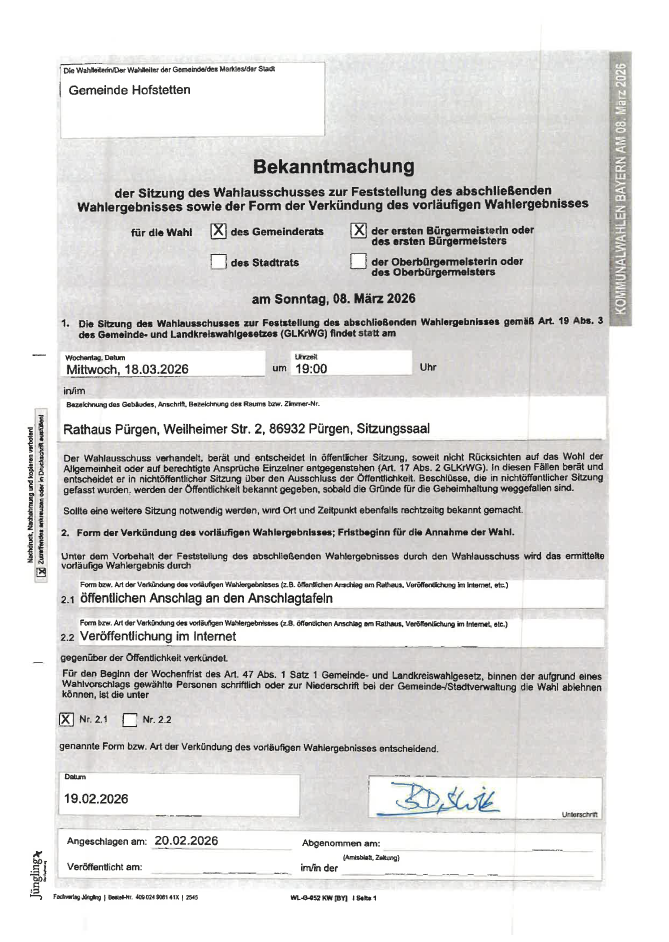 Der Gemeinderat Hofstetten hat in seiner Sitzung vom 24.09.2025 die vom Ing.-büro Veit Energie Consult GmbH erstellte Bestandsanalyse nach § 15 Wärmeplanungs-gesetz (WPG) und die Potentialanalyse nach § 16 WPG zustimmend zur Kenntnis genommen.